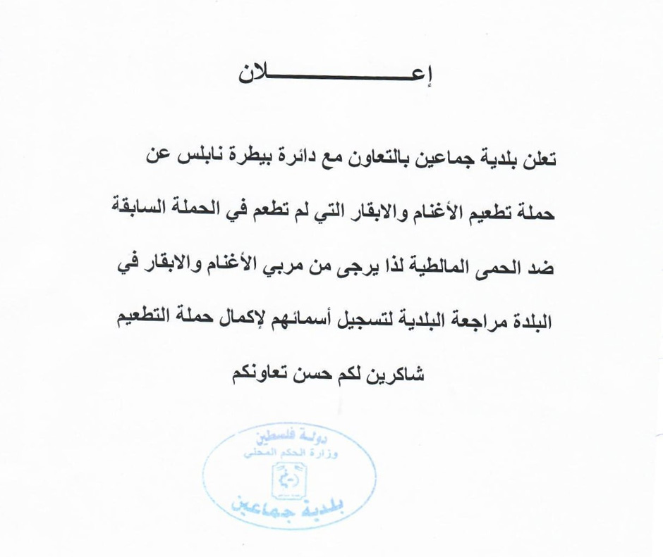 بلدية جماعين وبيطرة نابلس تعلنان عن حملة تطعيم الأبقار والأغنام ضد مرض الحمى المالطية.