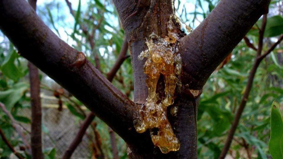 أعراضه- ظهور صمغ بلون بني مصفر على أجزاء النبات.