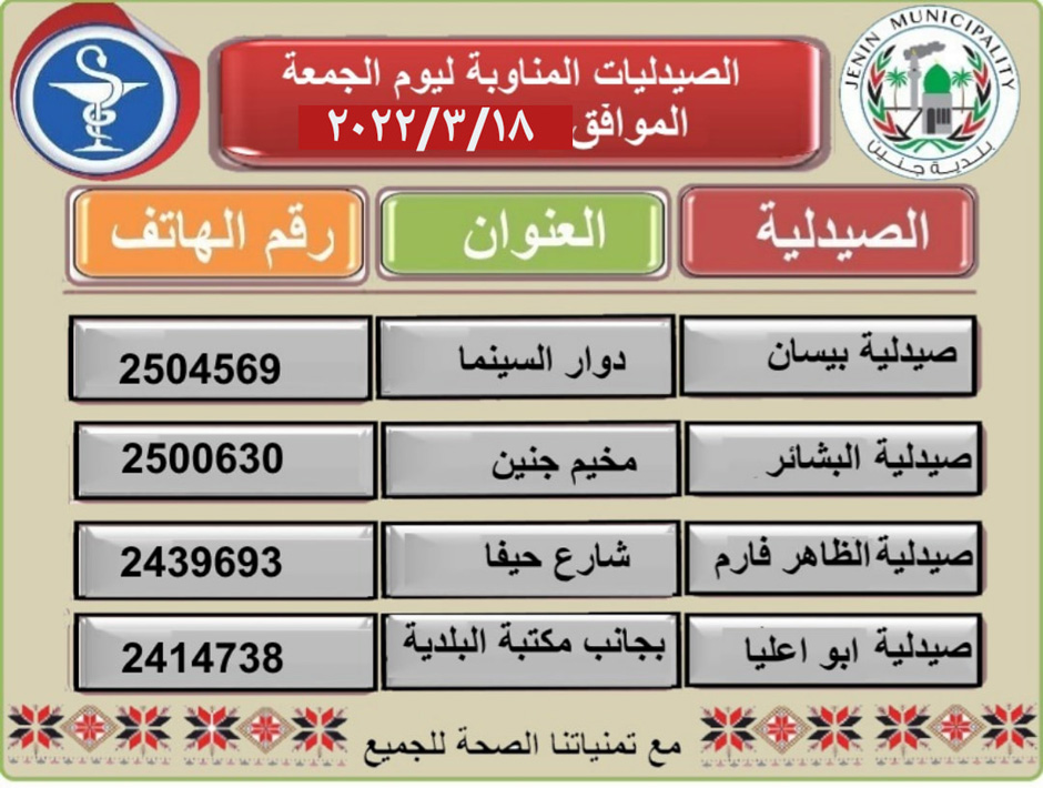 أرقام هواتف وأسماء الصيدليات المناوبة في مدينة جنين وضواحيها ليوم الجمعة 18.03.2022.