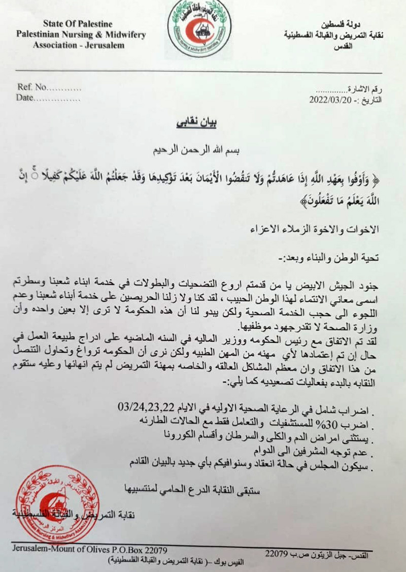 نشرت نقابة الترميض والقبالة، الأحد 20.03.2022، بياناً أعلنت فيه عن خطوات تصعيدية وإضراب احتجاجاً على عدم تنفيذ الحكومة ووزارة المالية للاتفاق العام الماضي.