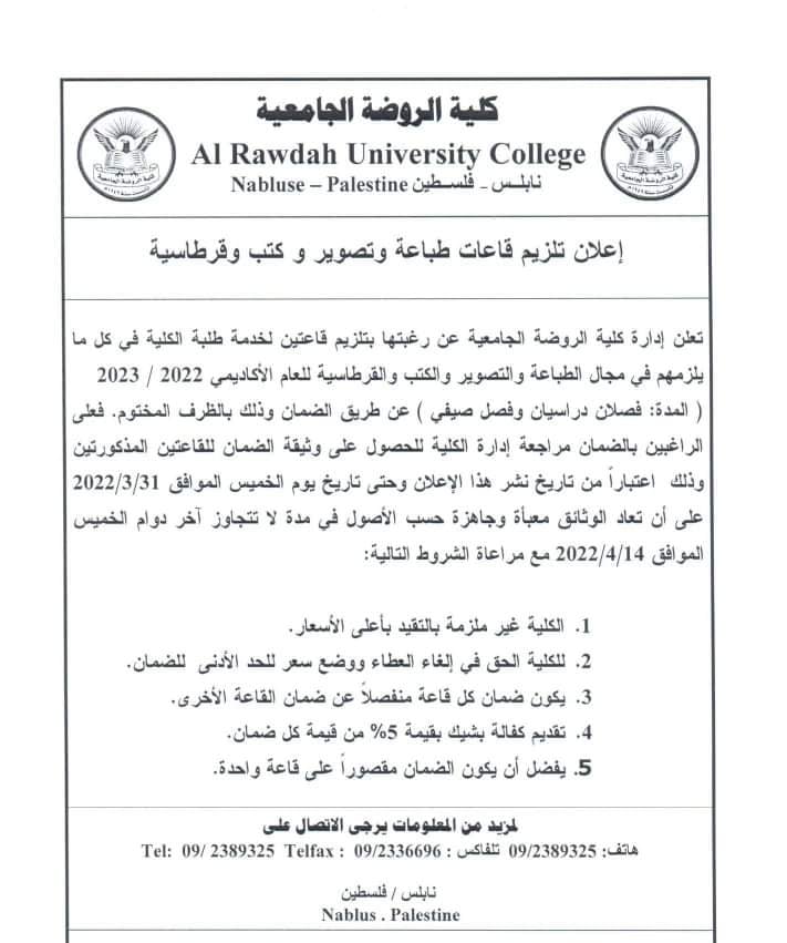 كلية الروضة: إعلان تلزيم قاعات طباعة وتصوير كتب