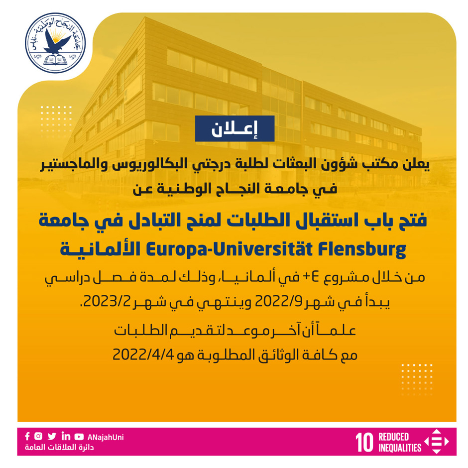أعلن مكتب شؤون البعثات لطلبة درجتي البكالوريوس والماجستير في جامعة النجاح الوطنية، الثلاثاء 22.03.2022، عن فتح باب استقبال الطلبات لمنح التبادل في جامعة Europa-Universität Flensburg الألمانية من خلال مشروع E+ في ألمانيا، وذلك لمدة فصل دراسي يبدأ في شهر 9/2022 وينتهي في شهر 2/2023.