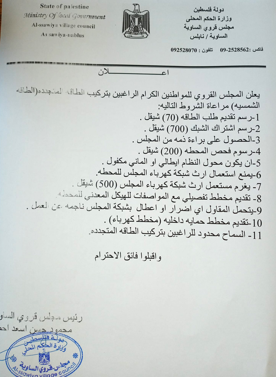 مجلس قروي الساوية يعلن للمواطنين الراغبين بتركيب ألواح طاقة شمسية مراجعة المجلس.