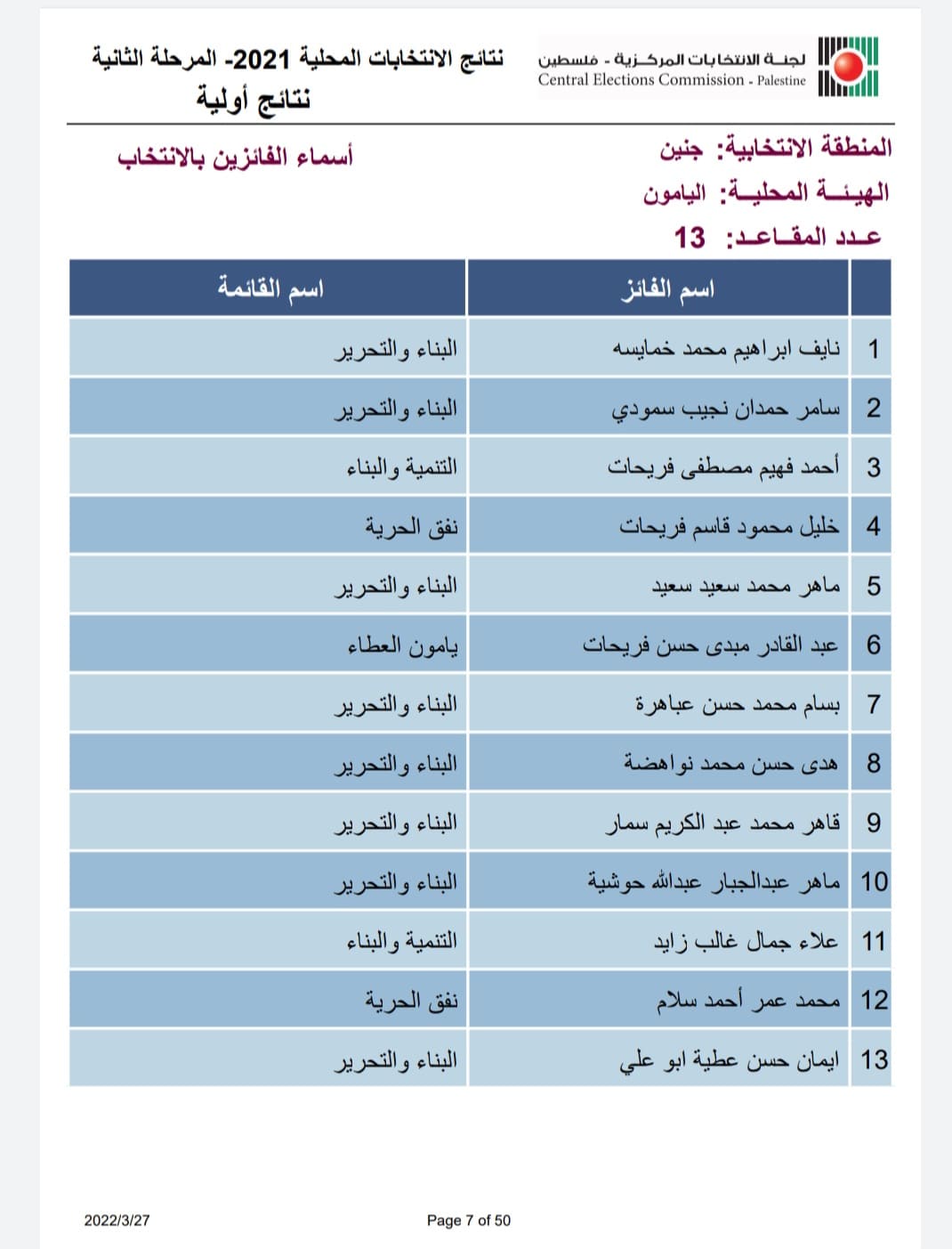 لجنة الانتخابات المركزية تعلن عن نتائج الانتخابات المحلية - المرحلة الثانية في اليامون - جنين، الأحد 27.03.2022.