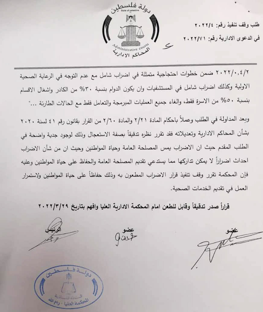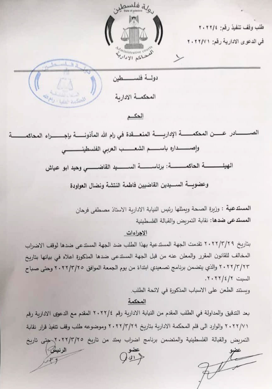 أصدرت المحكمة الإدارية في دولة فلسطين، الثلاثاء 29.03.2022، قراراً بوقف تنفيذ قرار إضراب نقابة التمريض والقبالة؛ حفاظاً على حياة المواطنين ولاستمرار العمل في تقديم الخدمات الصحية.