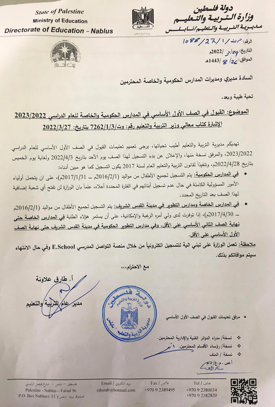 مديرية التربية والتعليم في نابلس تنشر تعليمات القبول في الصف الأول الأساسي في المدارس الحكومية والخاصة للعام الدراسي 2022-2023.