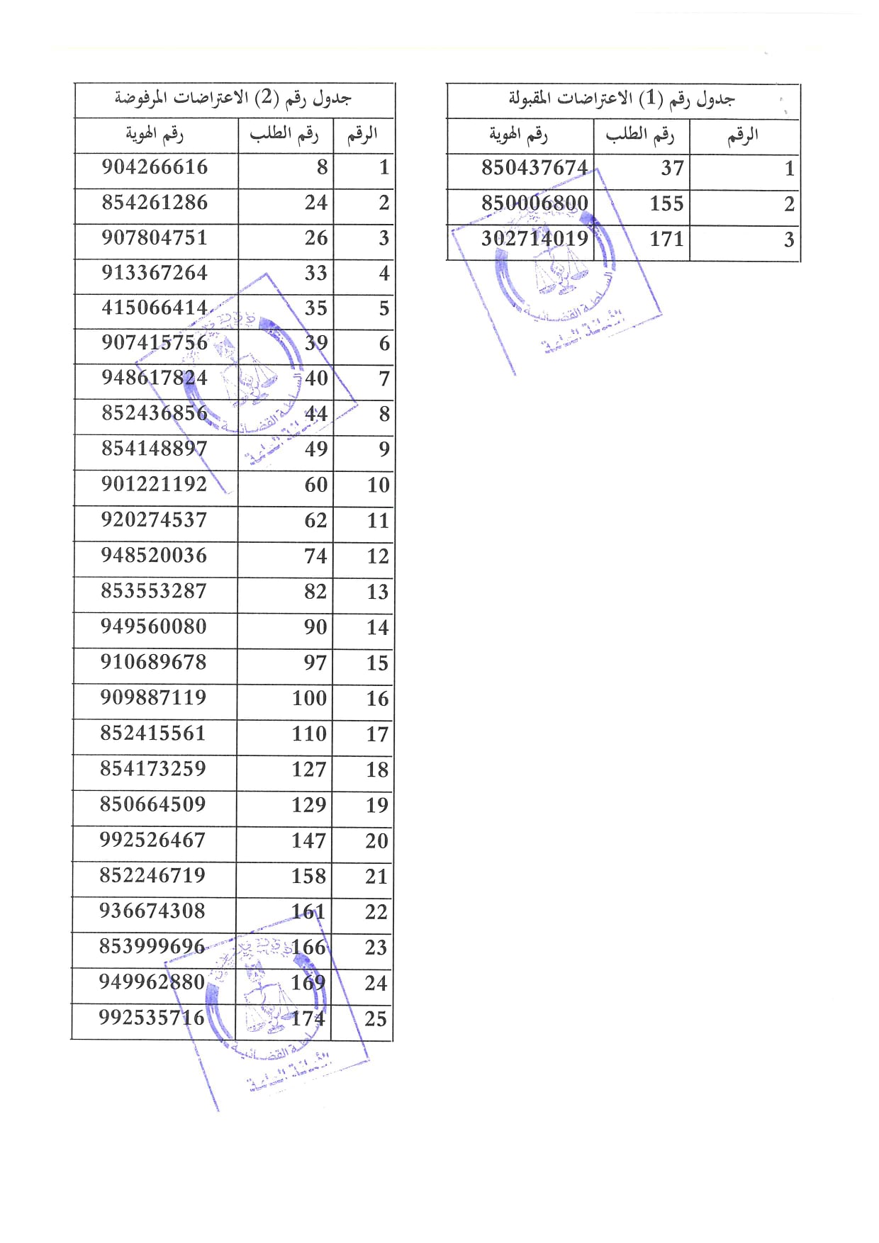 1. كشف بأرقام هويات السادة المعترضين الذين تم قبول اعتراضاتهم وضمهم الى قائمة الطلبات المقبولة للمسابقة القضائية، كما هو مبين في الجدول رقم 1 المرفق أدناه.