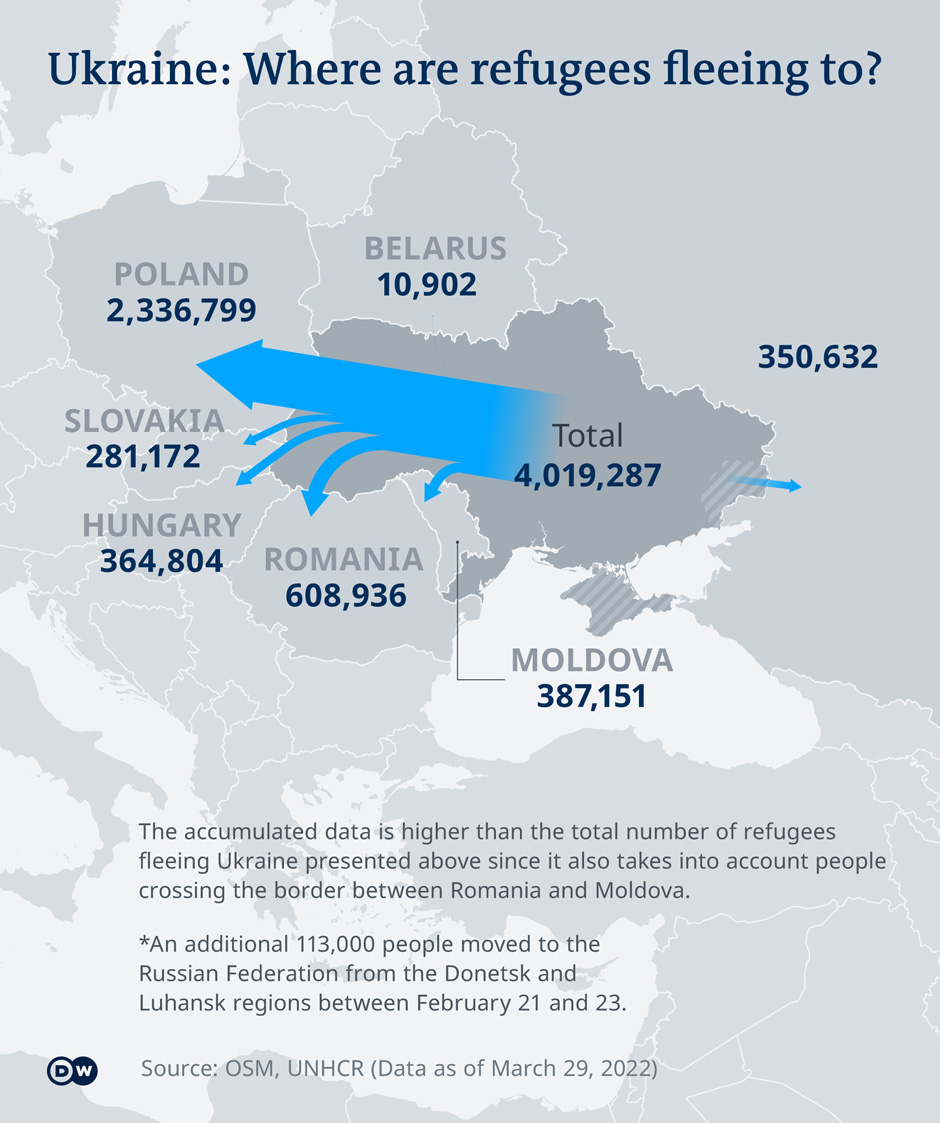 وقالت المفوضية السامية للأمم المتحدة لشؤون اللاجئين إن عدد الذين فروا من أوكرانيا عبر مختلف المعابر الحدودية لبلادهم منذ الغزو الروسي الذي بدأ في 24 شباط/فبراير، تجاوز الأربعة ملايين. ويمثل الأطفال أكثر من نصف هؤلاء اللاجئين، ومعظم الباقين من النساء.