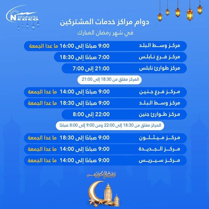 شركة توزيع كهرباء الشمال نعلن عن دوام مراكز خدمات المشتركين خلال شهر رمضان.