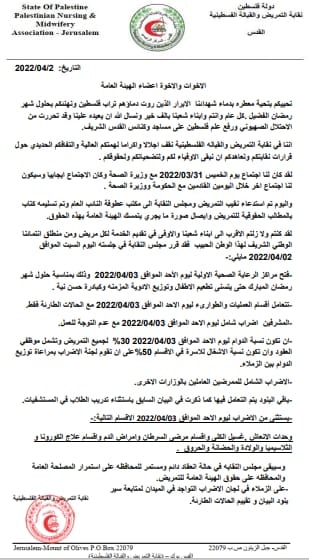 نقابة التمريض تعلن عن فتح مراكز الرعاية الصحية ليوم غد الأحد لتطعيم الأطفال وتوزيع أدوية الأمراض المزمنة.