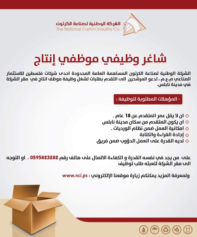 الشركة الوطنية لصناعة الكرتون المساهمة العامة المحدودة إحدى شركات فلسطين للاستثمار الصناعي م.ع.م ، تدعو المرشحين إلى التقدم بطلبات لشغل وظيفة موظف إنتاج في مقر الشركة في مدينة نابلس.
