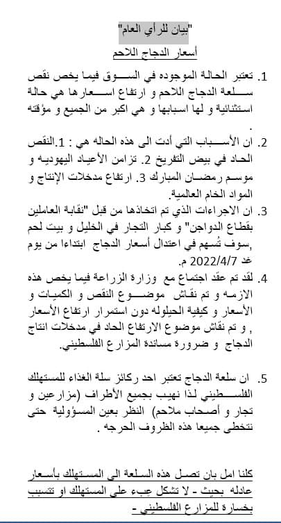 نقابة العاملين في قطاع الدواجن تقول إن أسعار الدجاج ستبدأ بالاعتدال من الخميس 07.04.2022.