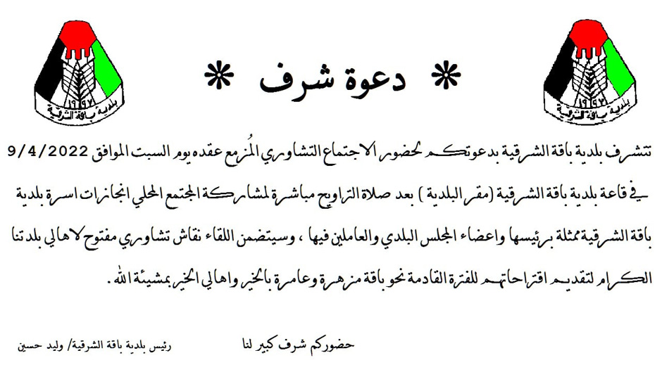 تتشرف بلدية باقة الشرقية بدعوتكم لحضور الاجتماع التشاوري المُزمع عقده يوم السبت 9/4/2022.