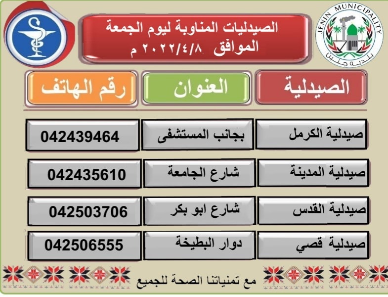 أرقام هواتف وأسماء الصيدليات المناوبة في مدينة جنين وضواحيها ليوم الجمعة 08.04.2022.