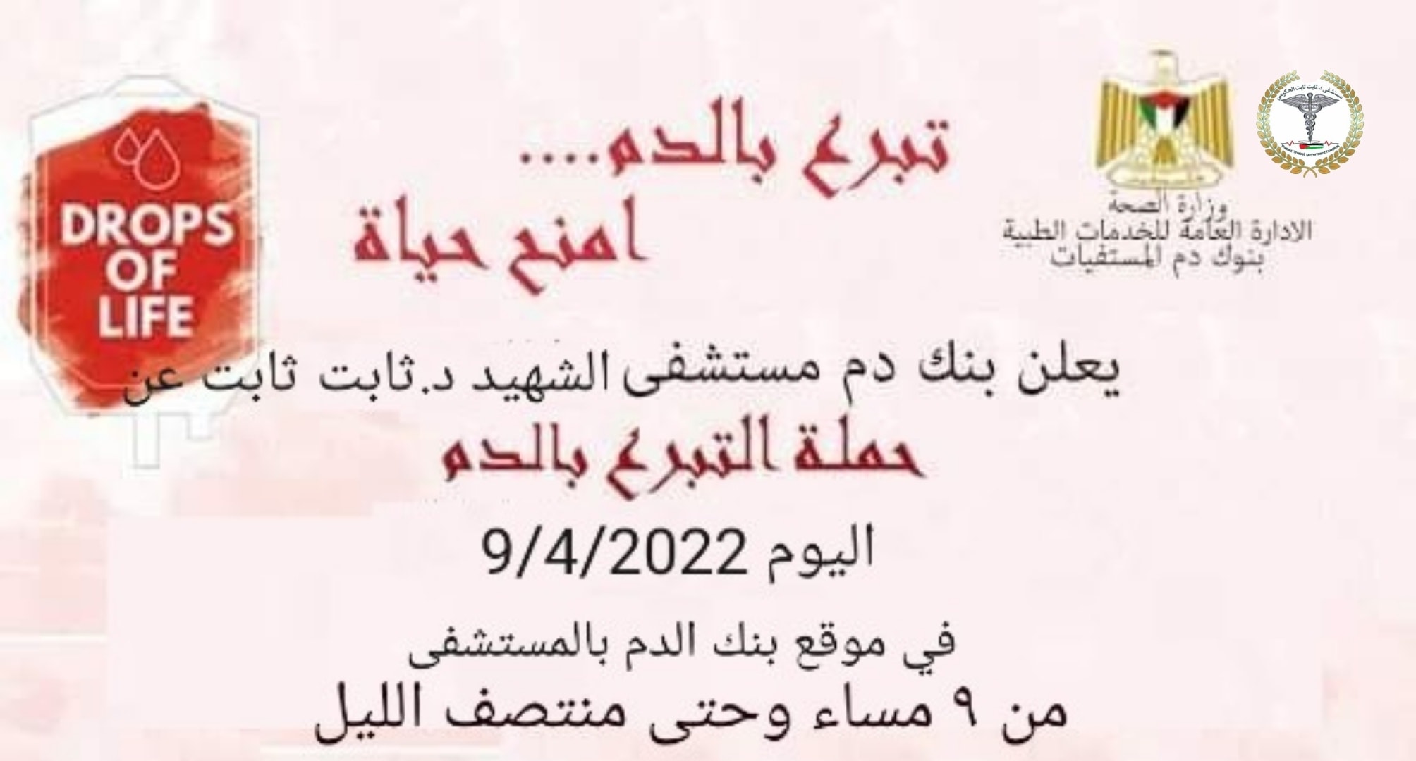 مستشفى ثابت ثابت يعلن عن حملة التبرع بالدم في موقع بنك الدم بالمستشفى بطولكرم الليلة الساعة 9 مساء.