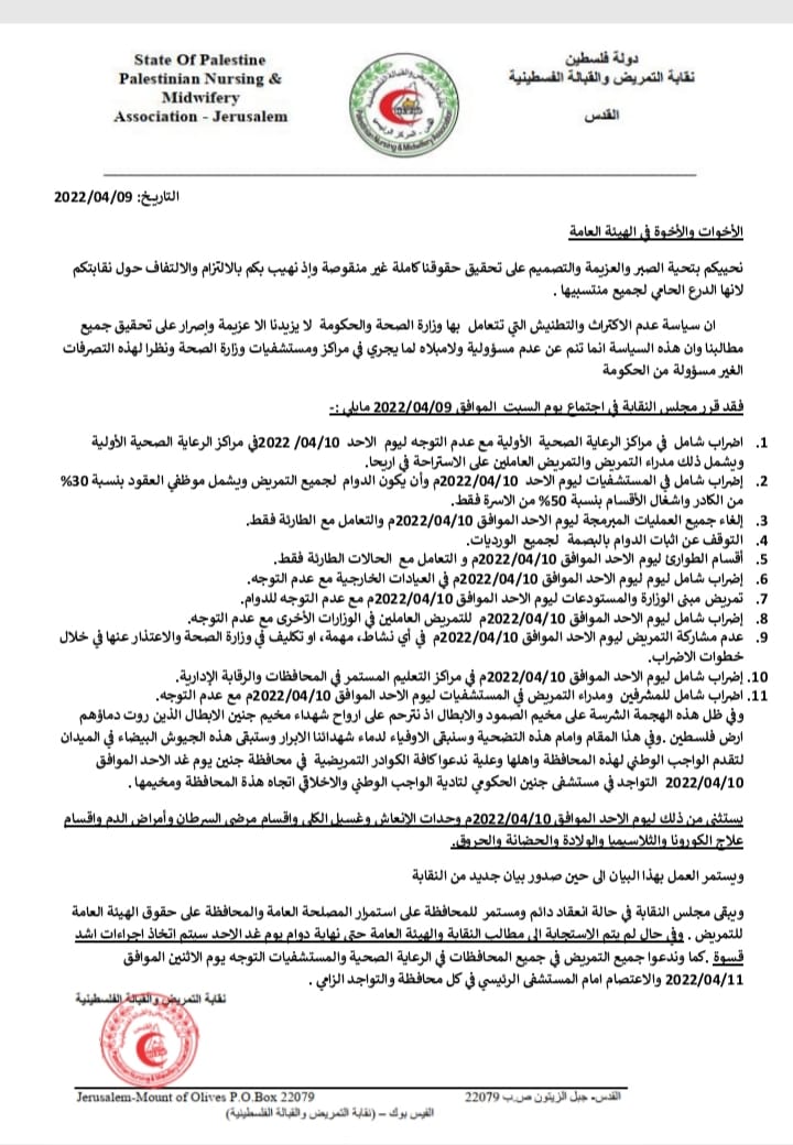 - اعتصام لتمريض الصحة وتمريض المستشفيات يوم الاثنين أمام مستشفى رفيديا الحضور الزامي للجميع.