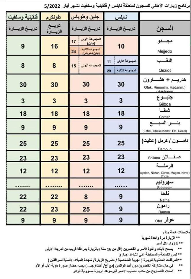 برنامج زيارات الأهالي للسجون الإسرائيلية لمناطق نابلس وقلقيلية وسلفيت وجنين وطوباس وطولكرم لشهر أيار 2022.