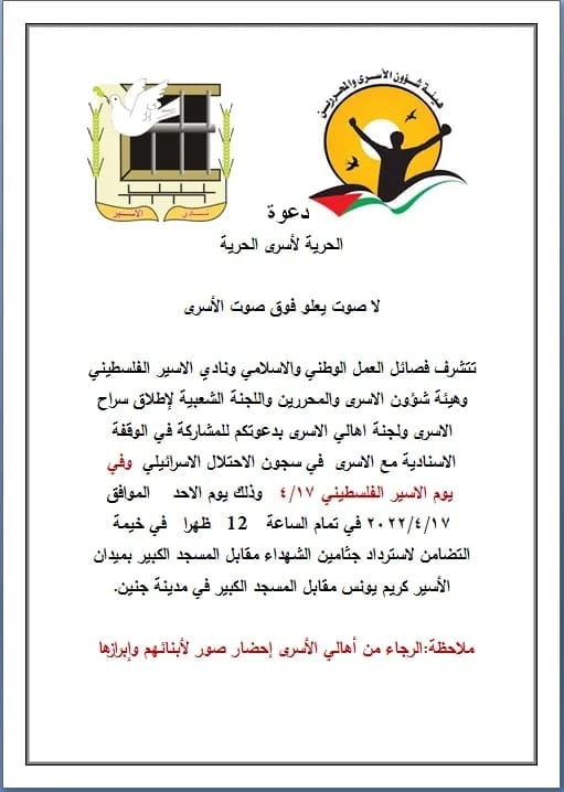دعوة: إحياء يوم الأسير الفلسطيني في جنين