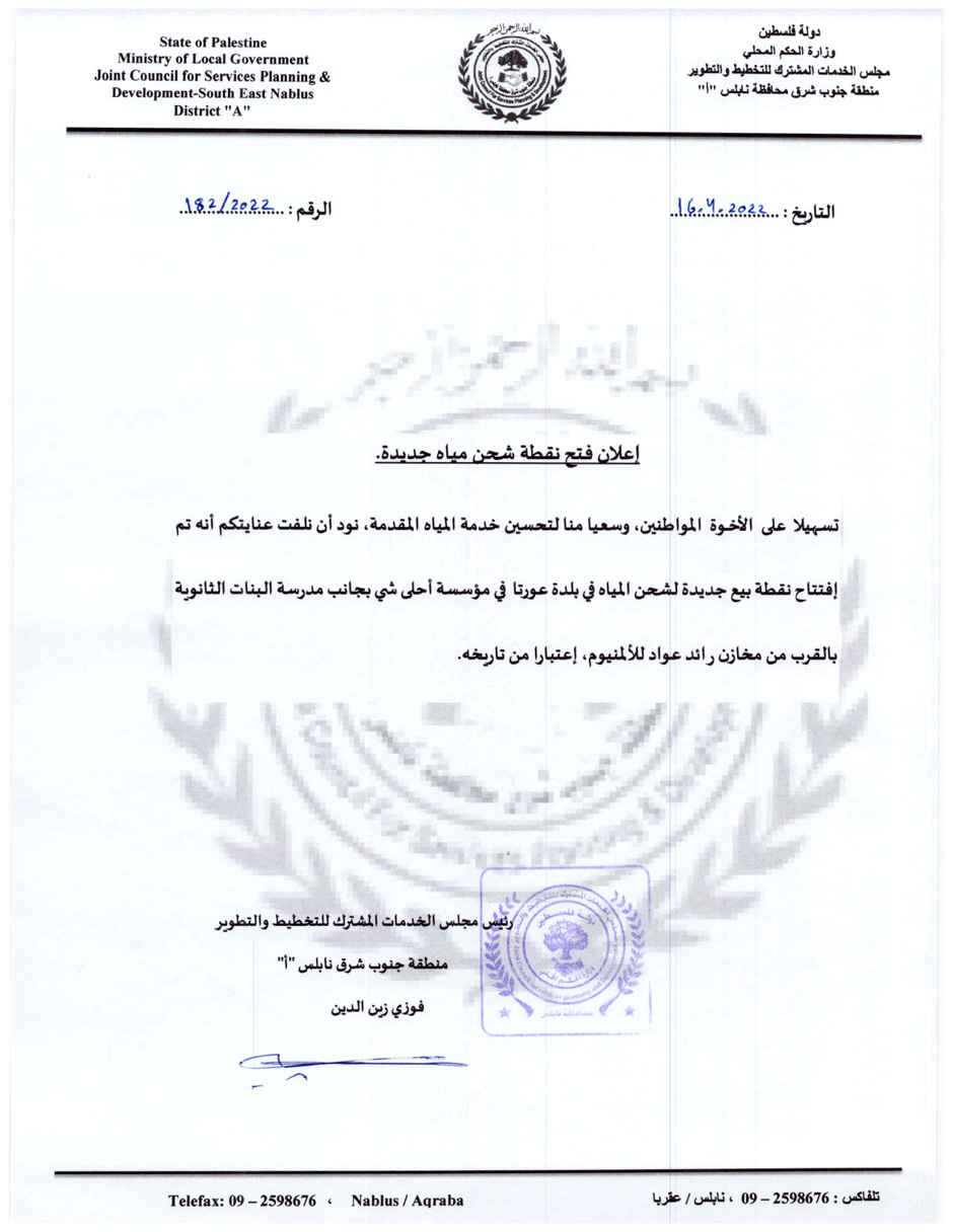 مجلس قروي عورتا يعلن عن فتح نقطة شحن مياه جديدة في القرية.