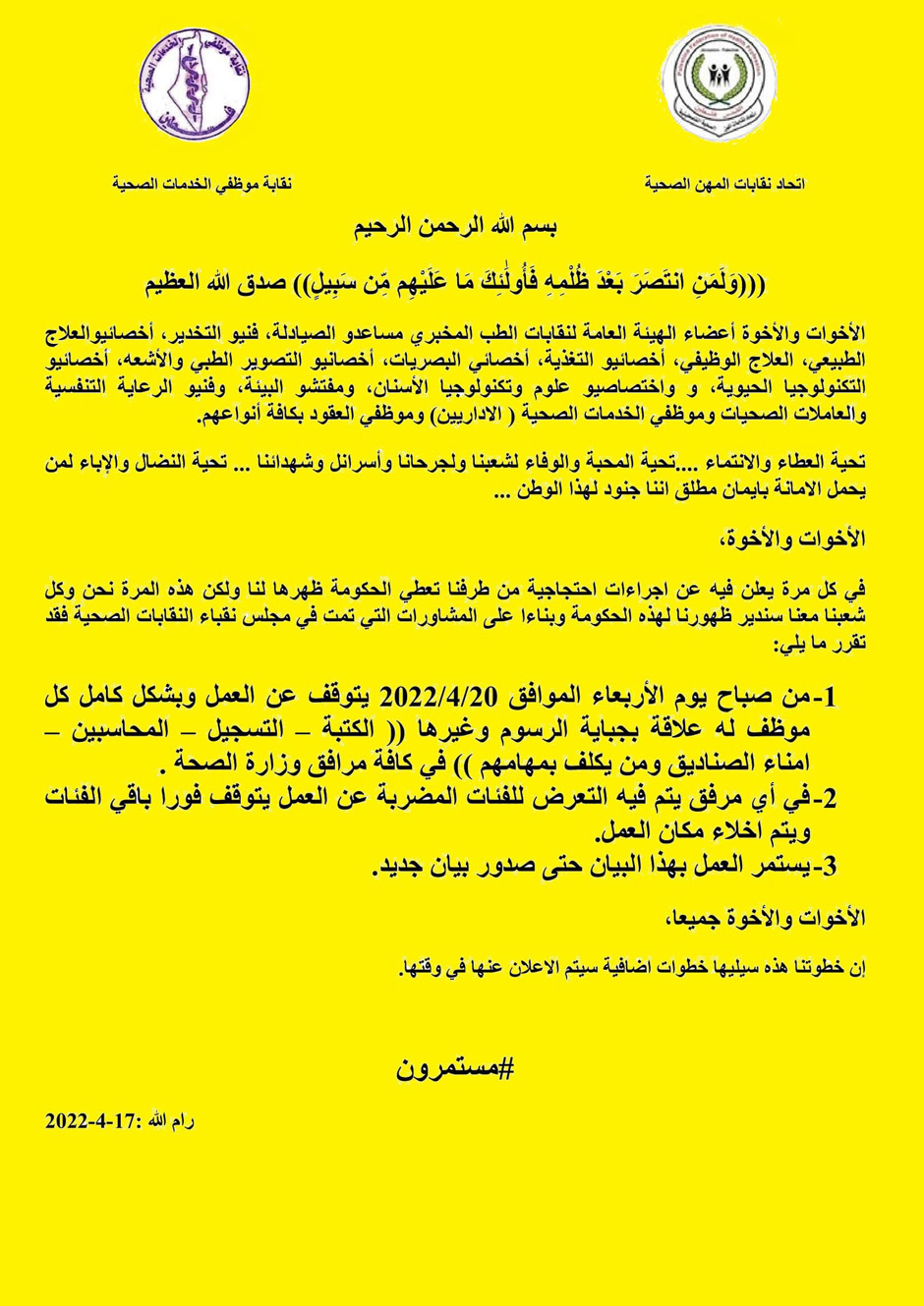 اتحاد نقابات المهن الصحية ونقابة موظفي الخدمات الصحية يعلنون عن خطوات احتجاجية جديدة.