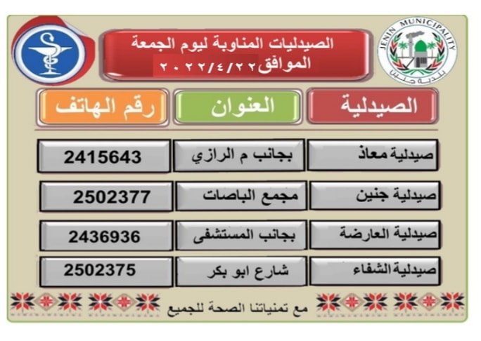 الصيدليات المناوبة في مدينة جنين وضواحيها ليوم الجمعة 22.04.2022.