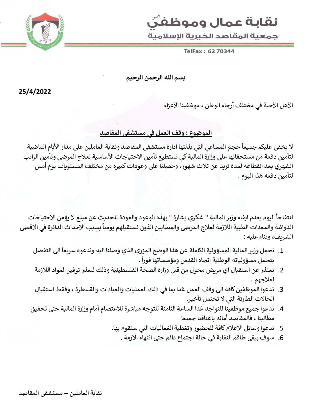نقابة عمال وموظفي المقاصد تعتذر عن استقبال أي مريض محول من وزارة الصحة.