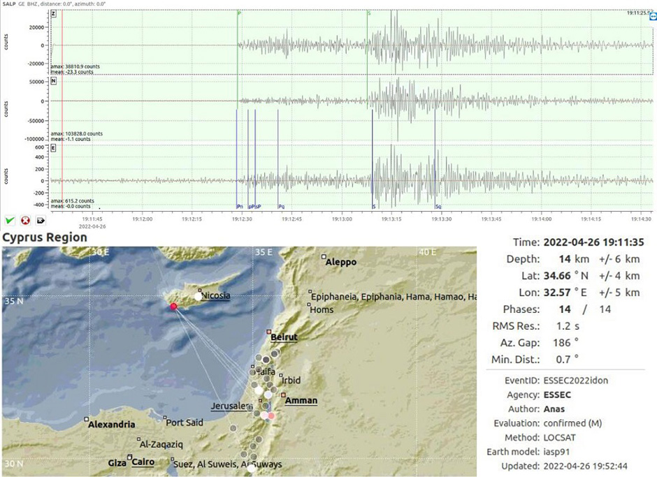 وأضاف أن بؤرة الزلزال تبعد 22 كم جنوب شرق مدينة بافوس القبرصية و57 كم جنوب غرب مدينة ليماسول القبرصية و405 كم شمال - غرب مدينة القدس، وشعر بهذا الزلزال السكان القاطنين بالتجمعات السكنية للدول الواقعة شرق البحر المتوسط.