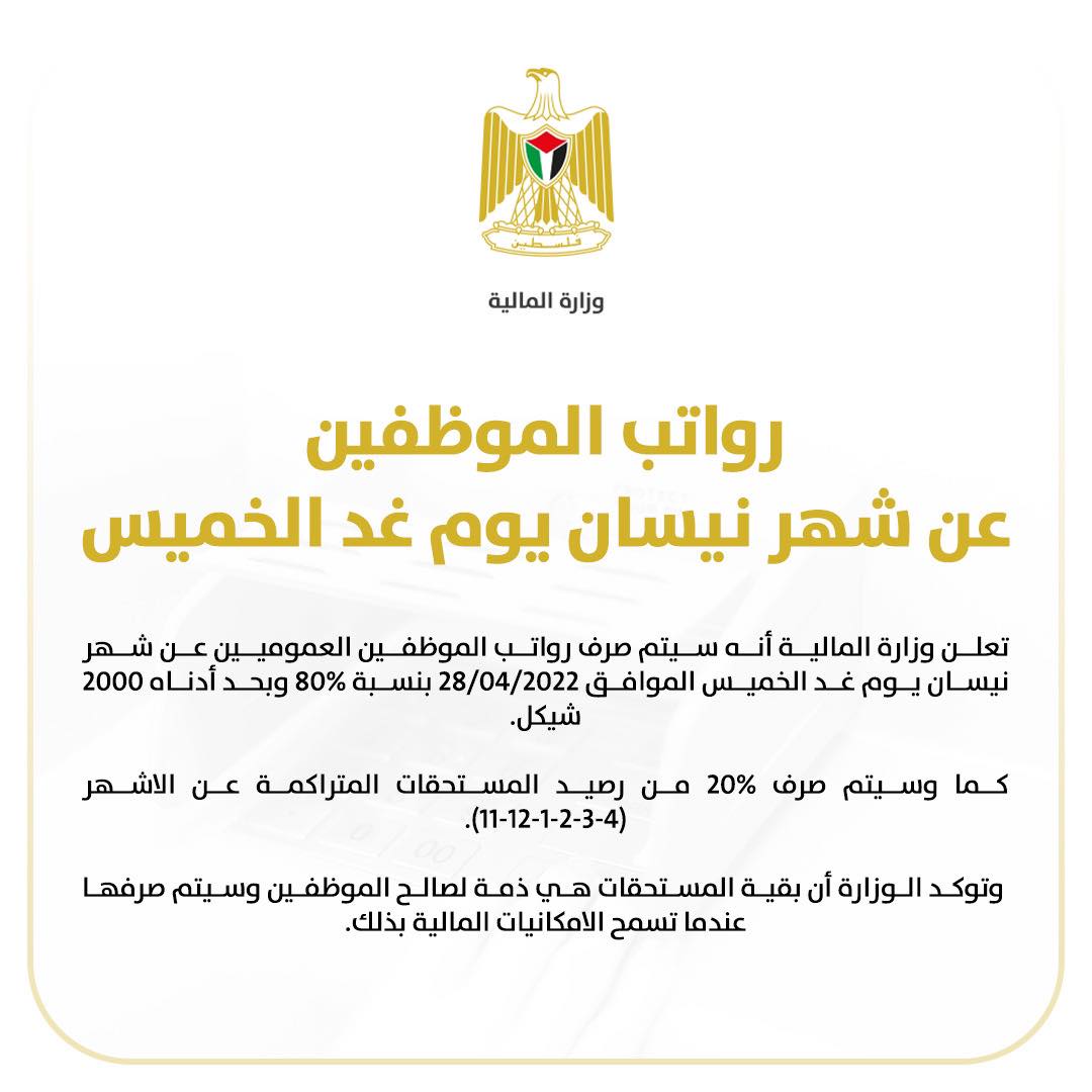 أعلنت وزارة المالية، الأربعاء 27.04.2022، عن أنه سيتم صرف رواتب الموظفين العموميين عن شهر نيسان/ 2022، يوم غد الخميس 28/04/2022 بنسبة 80% وبحد أدناه 2000 شيكل.