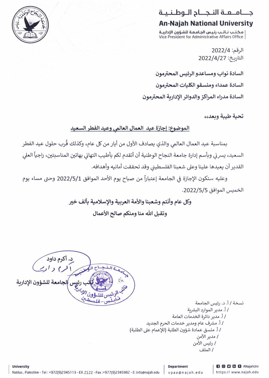 عمادة شؤون الطلبة تعلن عن موعد عطلة عيد العمال العالمي وعيد الفطر السعيد 2022.