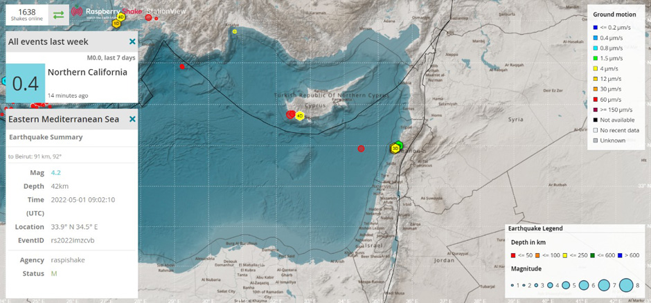 ضرب زلزال خفيف بقوة 4.2 درجة على مقياس ريختر، الأحد 01.05.2022، شرق البحر الأبيض المتوسط.