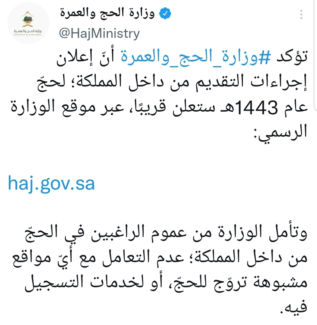 وقالت إنها تأمل من عموم الراغبين في الحج من داخل المملكة، عدم التعامل مع أي مواقع مشبوهة تروج للحج، أو لخدمات التسجيل فيه.