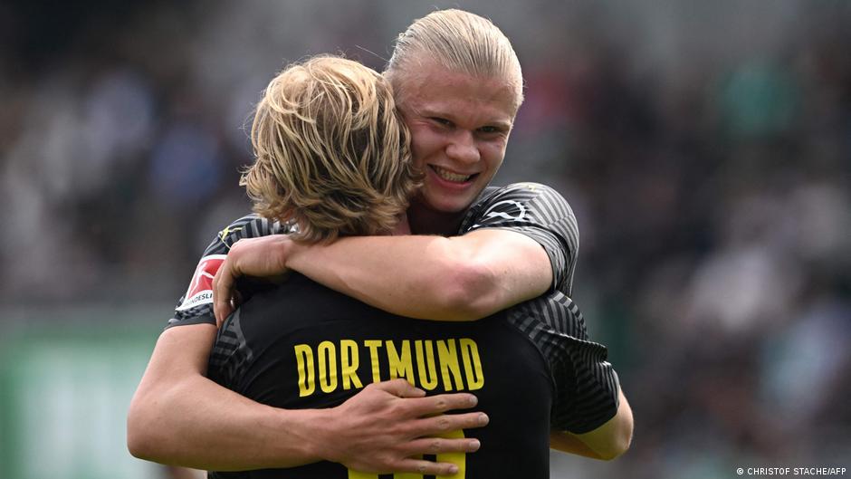 نجم دورتموند هالاند يحضن زميله يوليان براندت بعد تسجيل الأخير الهدف الأول للفريق أمام غرويتر فورت (السابع من أيار/مايو 2022)