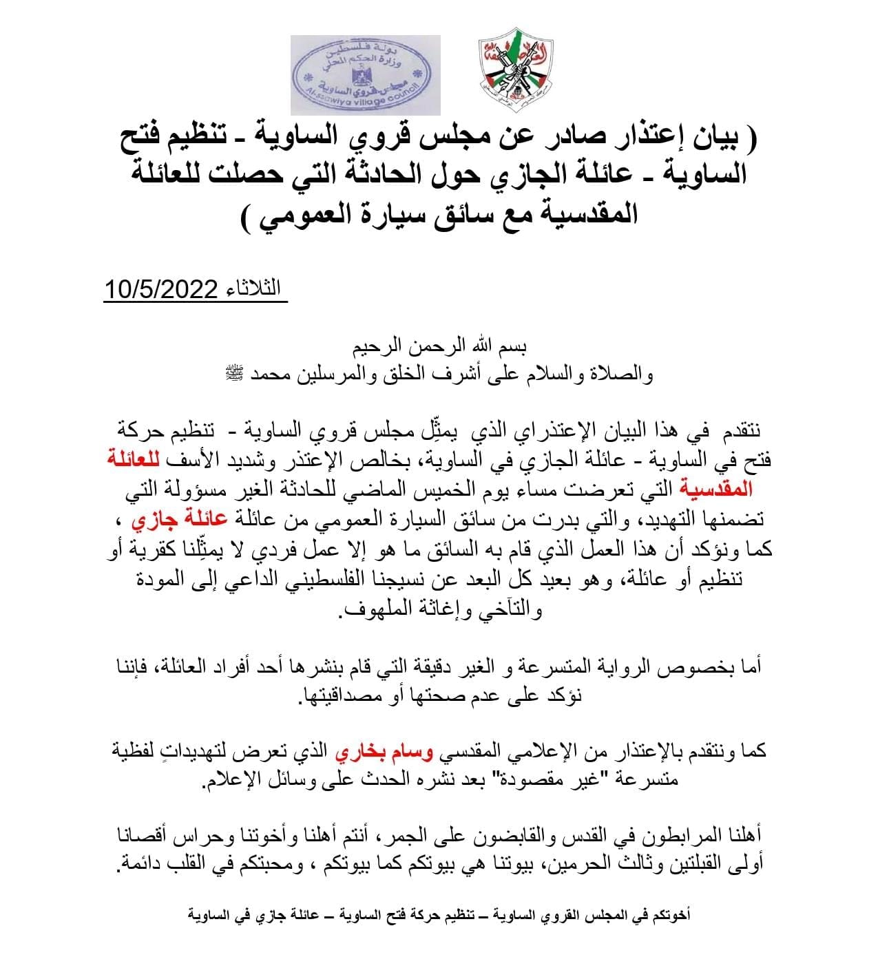أصدر مجلس قروي الساوية - تنظيم فتح، الثلاثاء 10.05.2022، بياناً حول حادثة الاستغلال والترهيب التي تعرضت لها إحدى العائلات المقدسية من سائق مركبة عمومية، وما تبعها من تهديدات غير مسؤولة من السائق للإعلامي الذي نشر الخبر، كما ويتضمن البيان الحالي تكذيباً وإنكاراً لرواية أحد أفراد عائلة السائق الذي قام بنشر بيان تضليلي للأحداث.