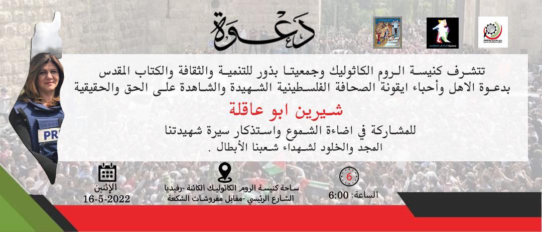 جمعية بذور للتنمية والثقافة تطلق اسم شيرين أبو عاقلة على مركزها التدريبي في فرع نابلس، وتدعو للمشاركة في إضاءة الشموع بالتعاون مع كنيسة الروم الكاثوليك وجمعية الكتاب القدس في نابلس.