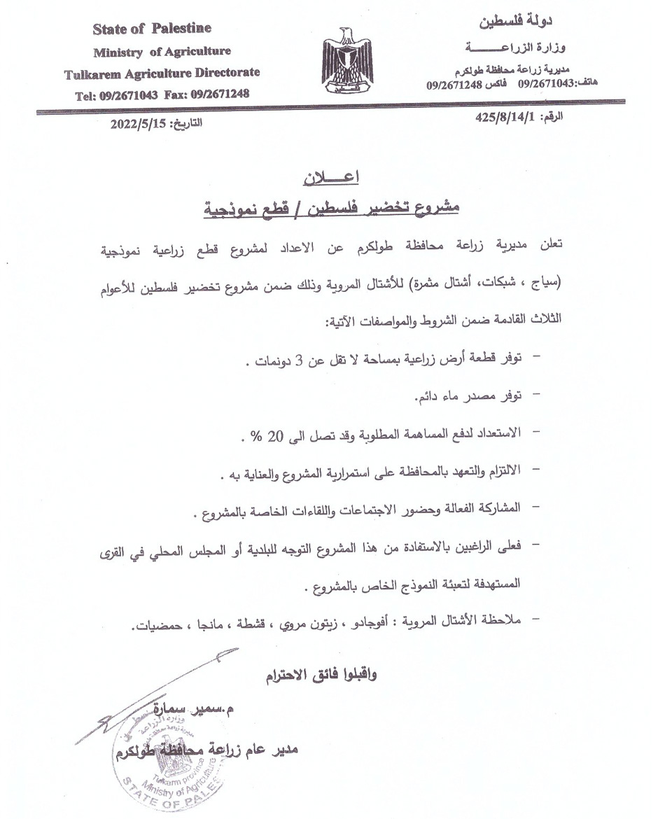 بلدية باقة الشرقية ومديرية زراعة طولكرم يعلنان عن فتح باب التسجيل في مشروع تخضير فلسطين.