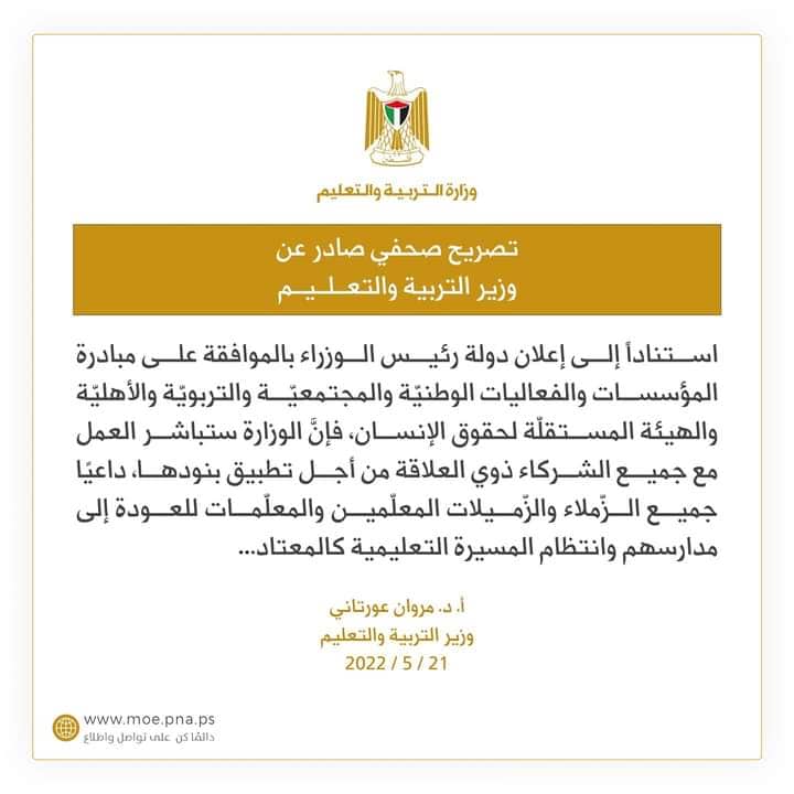 وزير التربية والتعليم مروان عورتاني يدعو المعلمين والمعلمات إلى بالعودة إلى مدارسهم وانتظام المسيرة التعليمة كالمعتاد.