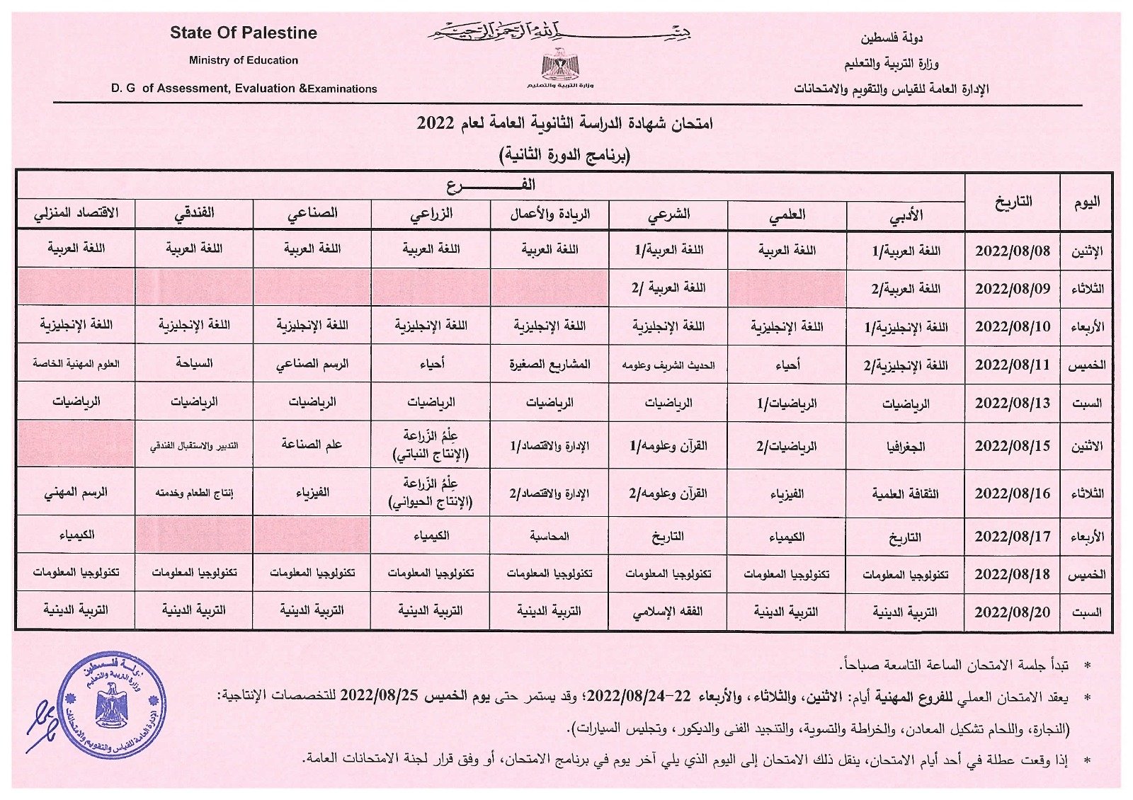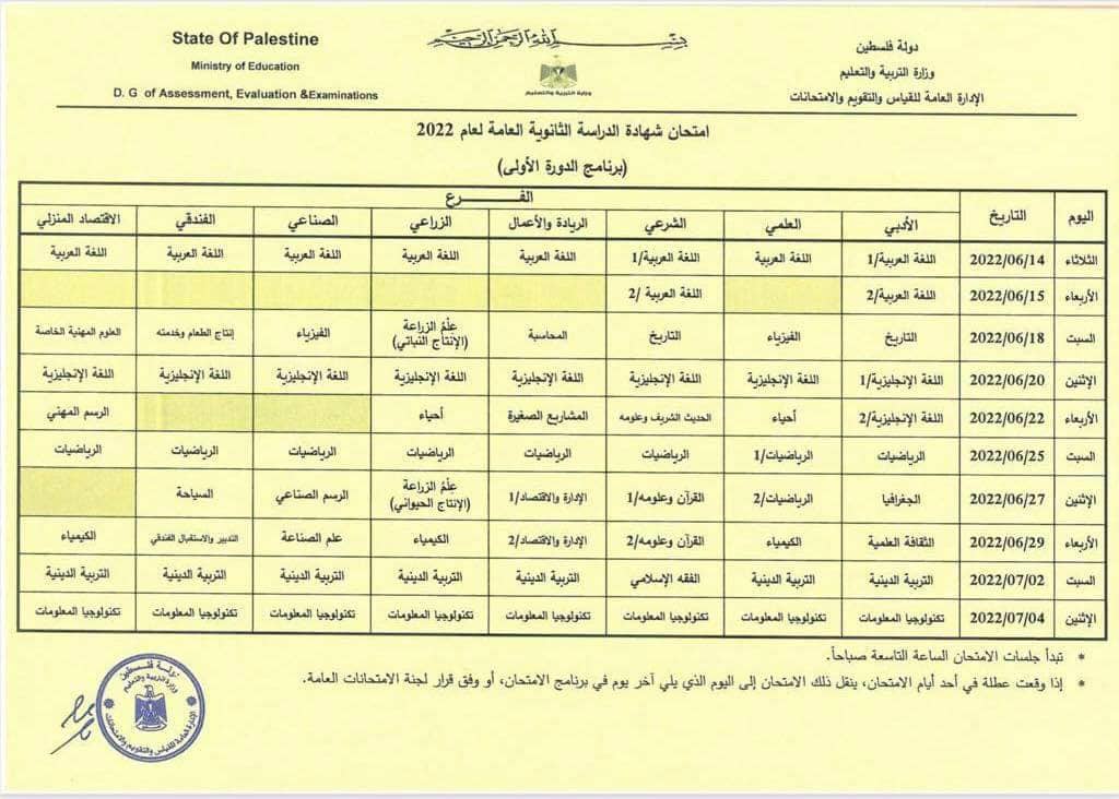 جدول امتحان التوجيهي المعدل