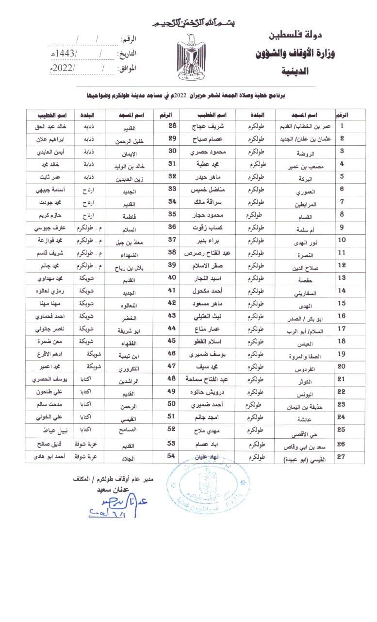 البرنامج الدوري الخطابة لشهر حزيران 2022 في مدينة طولكرم والضواحي.