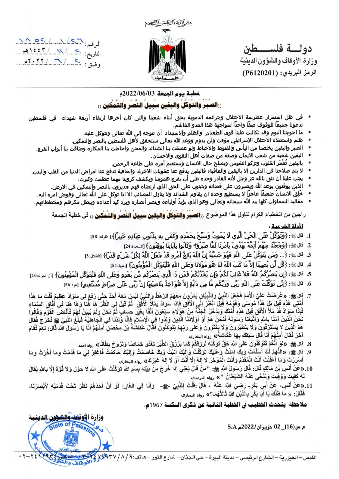 "الصبر والتوكل واليقين سبيل النصر والتمكين" موضوع خطبة صلاة الجمعة 03.06.2022.