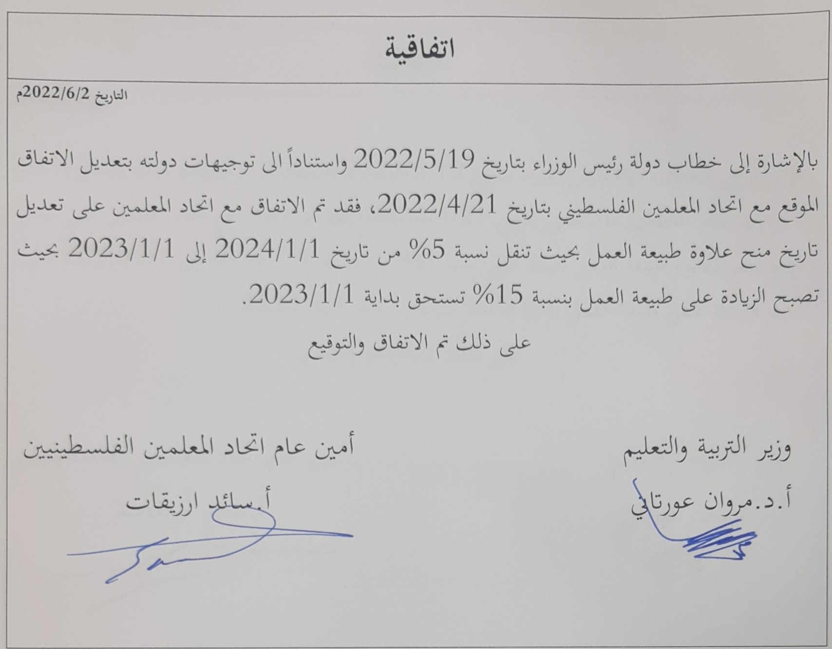 الاتفاق على تعديل الاتفاق الموقع مع الاتحاد لتصبح الزيادة على طبيعة العمل ١٥% تنفذ بداية 01.01.2023.