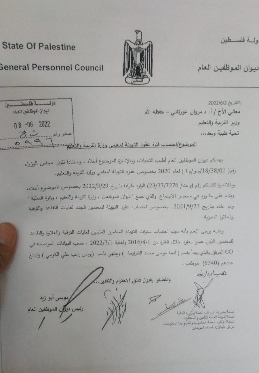 الموافقة على احتساب سنوات التهيئة للمعلمين المثبتين لغايات الترقية والعلاوة والتقاعد.