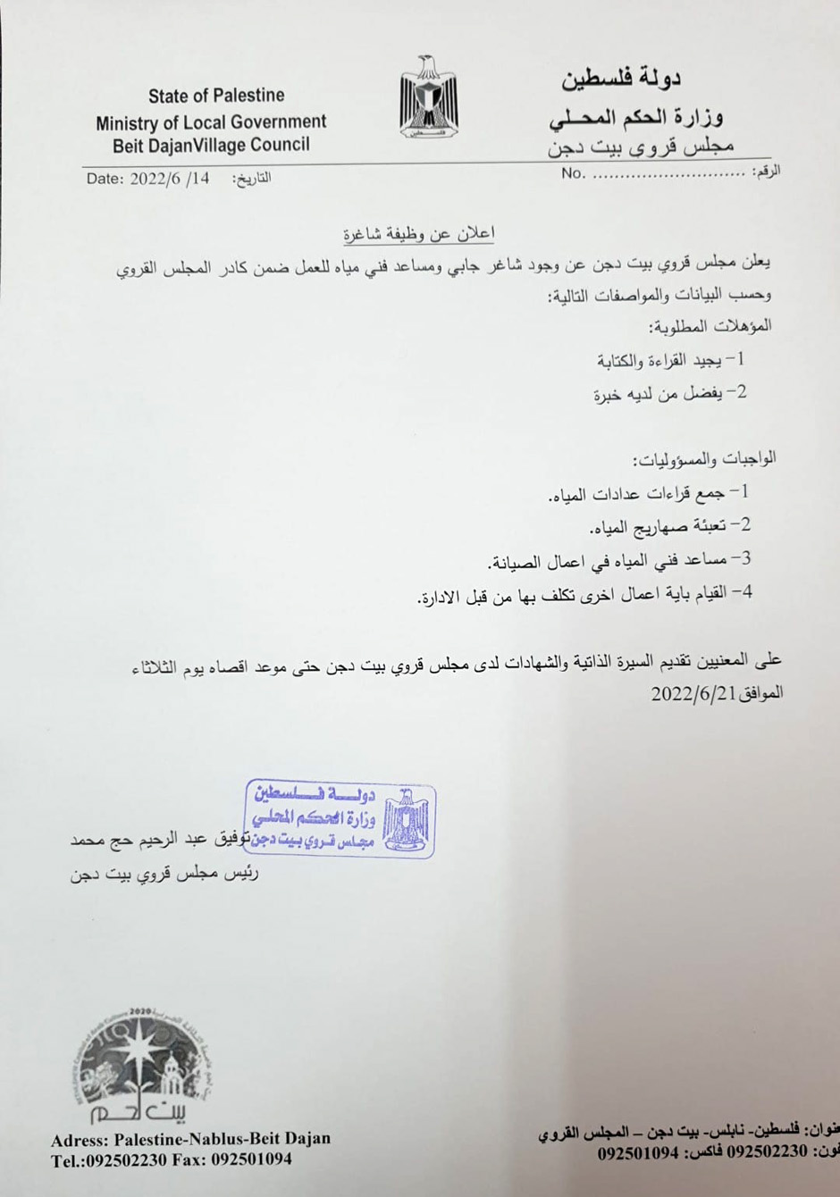 بيت دجن: مطلوب جابي ومساعد فني مياه