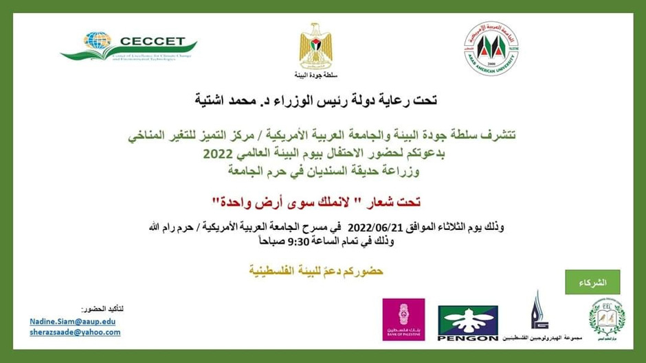 سلطة جودة البيئة تدعوكم للمشاركة في الاحتفال بيوم البيئة العالمي 2022 وزراعة حديقة السنديان في حرم الجامعة العربية الأميركية تحت رعاية رئيس الوزراء محمد اشتية وذلك تحت شعار (لا نملك سوى أرض واحدة).