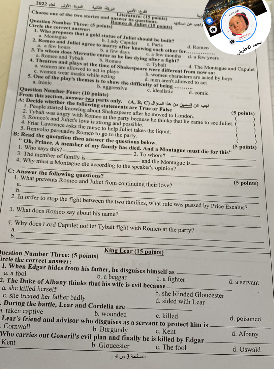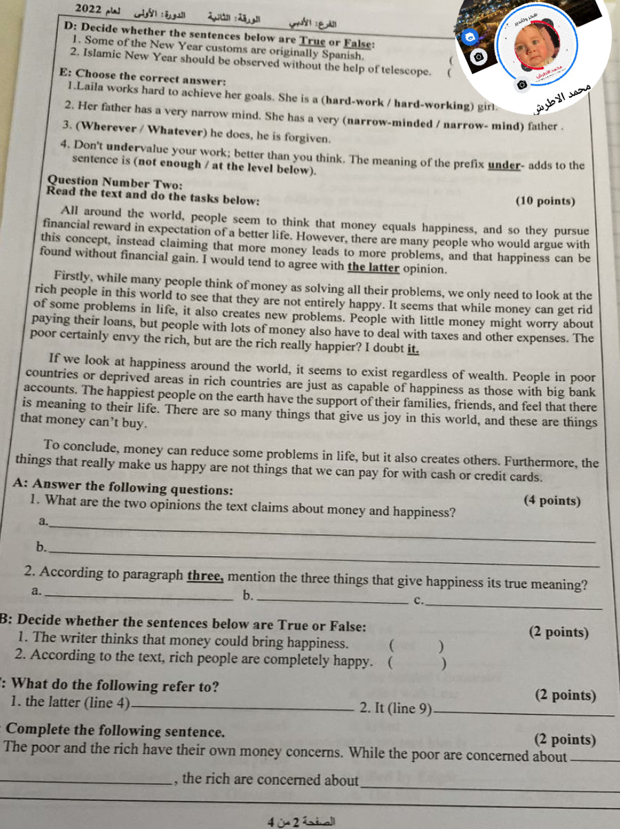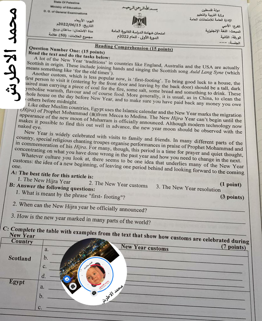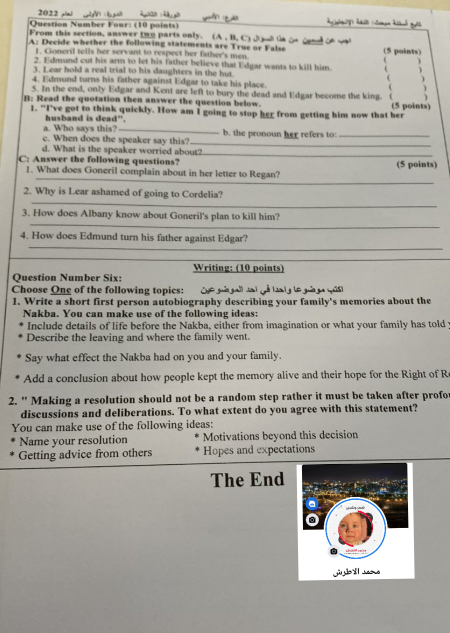 أسئلة امتحان الثانوية العامة لمادة اللغة الإنجليزية الجلسة الثانية لطلبة الأدبي، الأربعاء 22.06.2022.
