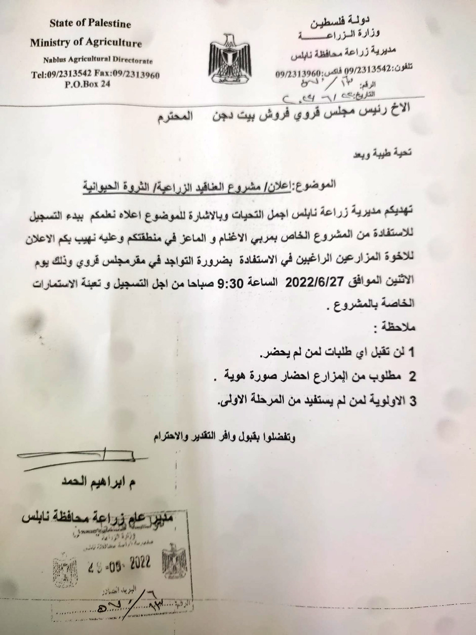 مديرية زراعة نابلس تنشر إعلاناً للمزارعين في مناطق الأغوار الوسطى بمحافظة نابلس حول مشروع العناقيد الزراعية للثروة الحيوانية.