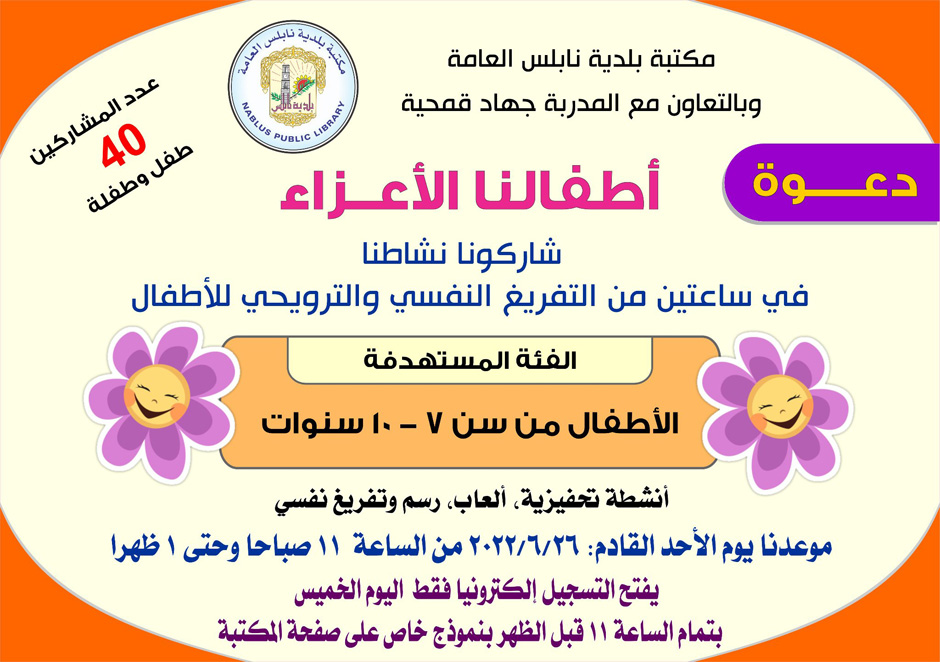 يفتح باب التسجيل إلكترونيا بتمام الساعة الحادية عشرة عبر نموذج خاص على صفحة مكتبة بلدية نابلس.