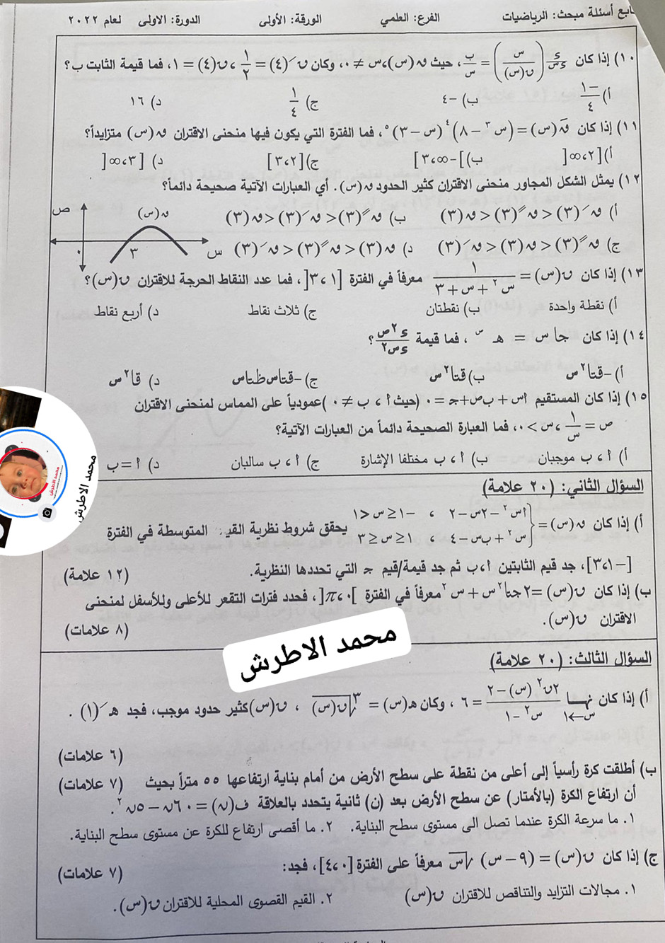 أسئلة امتحان الرياضيات الفرع العلمي