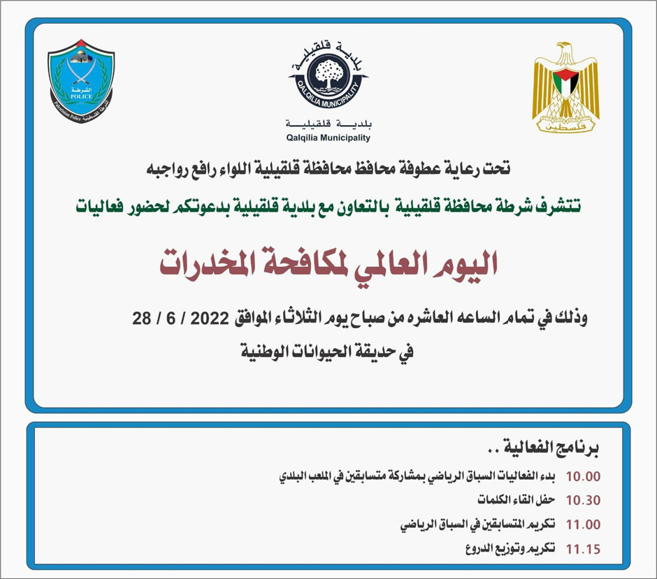 دعوة: فعاليات اليوم العالمي لمكافحة المخدرات في قلقيلية