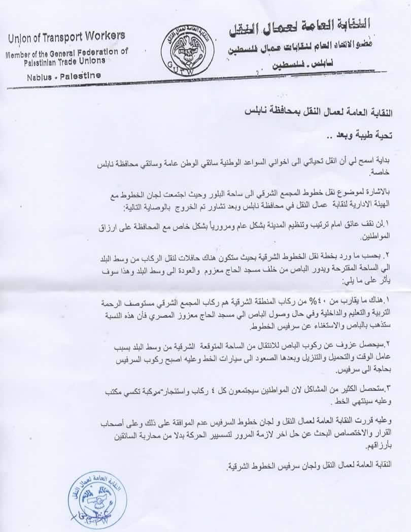 بعد اجتماع لجان الخطوط في محافظة نابلس مع الهيئة الإدارية للنقابة العامة، تم التأكيد على عدم الموافقة على نقل خطوط المجمع الشرقي إلى ساحة البلور، وفيما يلي توصيات النقابة واللجان.
