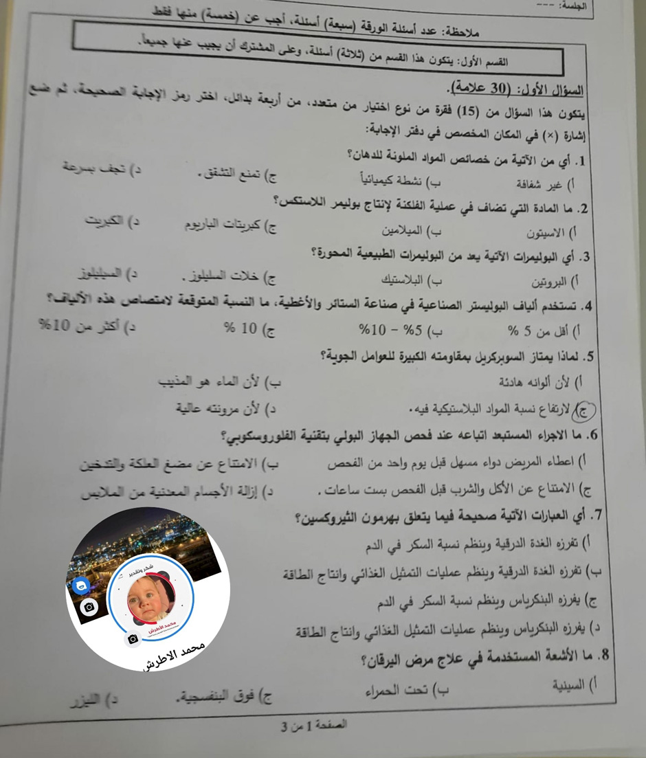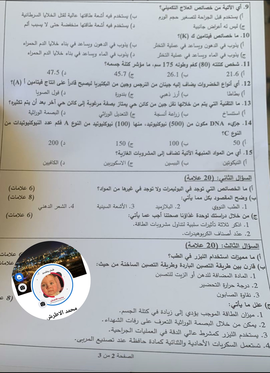 أسئلة امتحان الثقافة العلمية